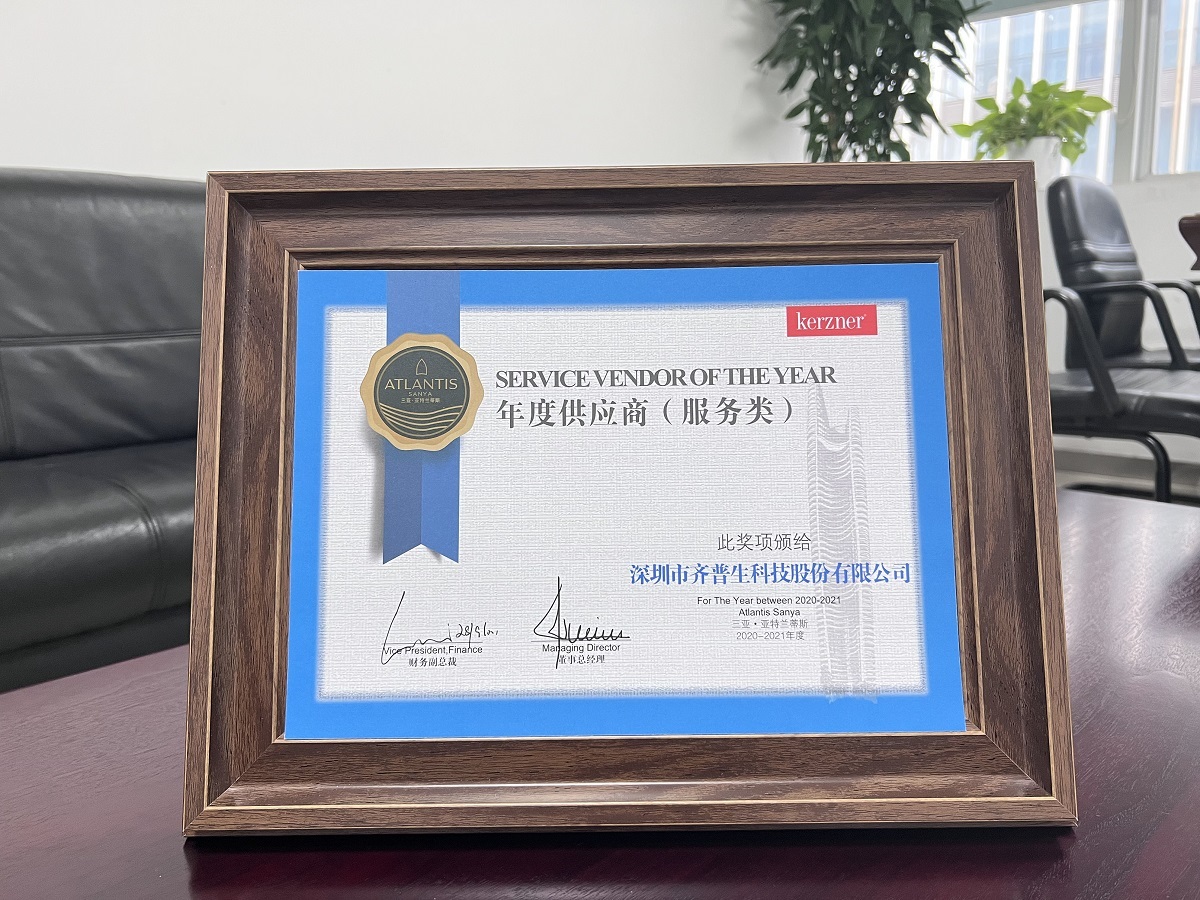 與優秀的人同行,你會變的更優秀。三亞·亞特蘭蒂斯酒店作為享譽全球的豪華型酒店,其對供應商資格的篩選,對供應商實力的審查,對供應商交付能力的要求都是以超高標準來執行的,深圳市齊普生科技股份有限公司能從數百家供應商隊伍中,拿到優秀供應商大獎,是三亞·亞特蘭蒂斯酒店對我們的認可,也是我們公司綜合實力的體現,這將鼓勵著我們不斷提高技能和服務水平,滿足高端客戶的需求。