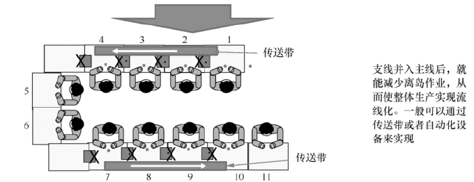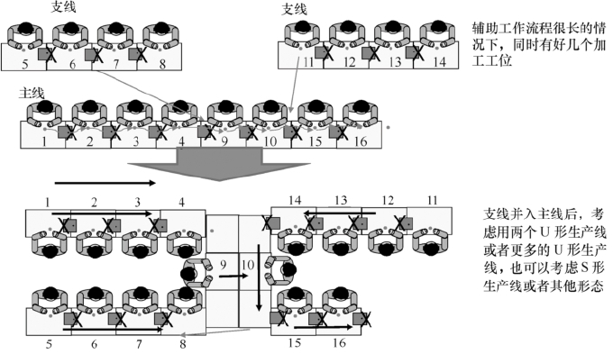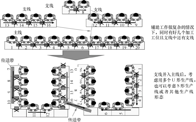 將支線并入主線的方法是,在簡單的兩三個支線工位使用小傳送帶或者工作臺上的滑軌傳遞物料。支線并入主線方法如下圖所示。