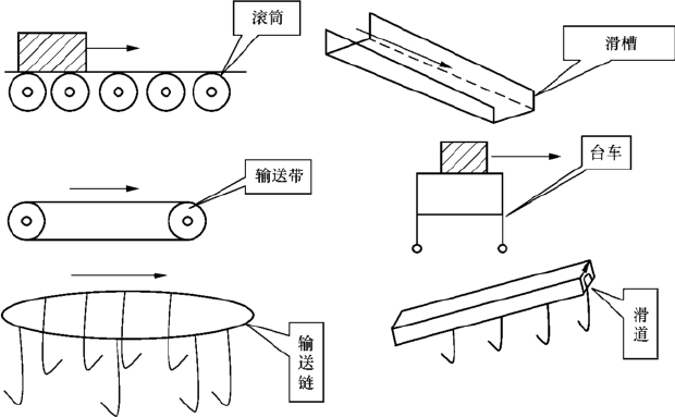 跨工位的傳遞方式有“窗簾式“上下滑道、自動吊掛輸送鏈、簡單夾具制作的滑道等,支線并入主線的物品如下圖所示。
